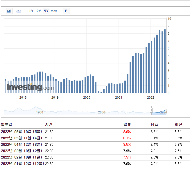 이번에 발표된 소비자 물가지수(CPI)는 예상치 8.3%보다 0.3% 높은 8.6%로 발표되며 주가 하락을 이끌었습니다.